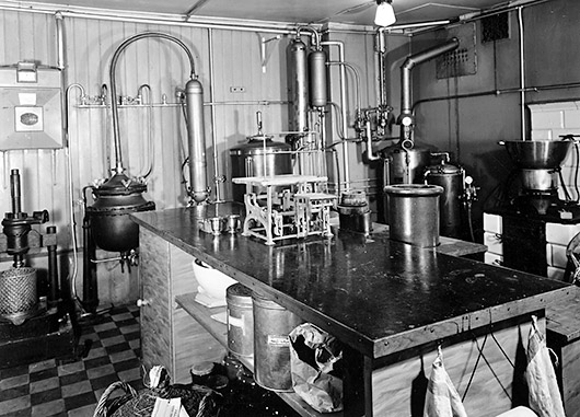 Bild från 1945 som visar laboratoriet på apoteket Hjorten (Alingsås apotek mellan 1862-1946). Rummet är fyllt med olika maskiner som apoteket använde för tablettillverkning och/eller andra ändamål.