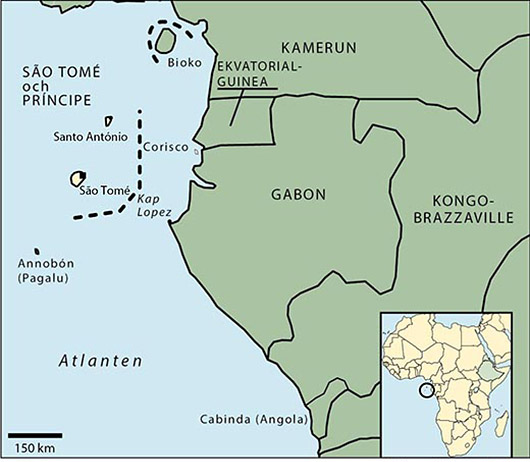 Öarna São Tomé och Príncipe ligger strax norr om ekvatorn i Guineabukten, cirka 50 mil rakt västerut från Gabon på Afrikas västkust. Öarna har ett tropiskt klimat.
