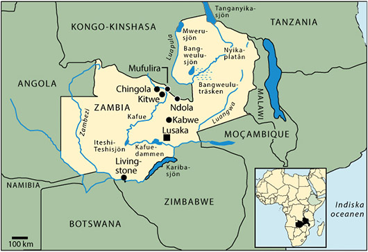 Artikel i Wikipedia där du kan läsa om Zambia ur olika perspektiv. Zambia, formellt Republiken Zambia, är en kustlös stat i södra Afrika, gränsande till Angola i väst, Kongo-Kinshasa och Tanzania i norr, Malawi i öst, och Moçambique, Namibia, Botswana och Zimbabwe i söder. Gruvnäringen har varit omfattande i landet och koppar är den viktigaste källan till exportinkomster...